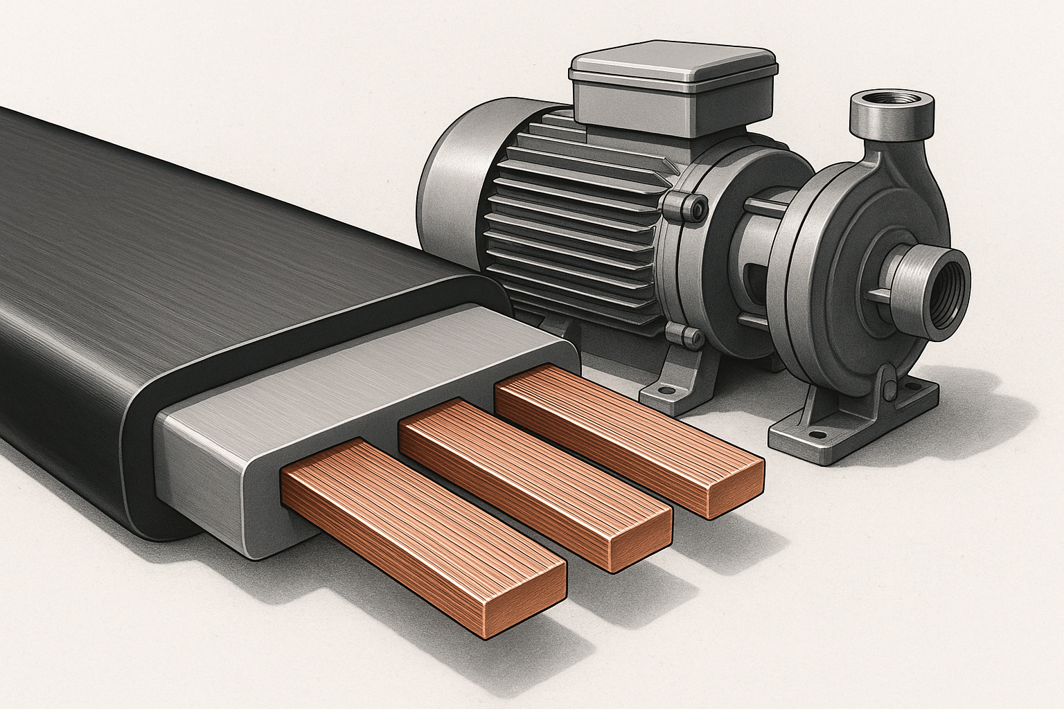 يتكون الكابل المسطح النموذجي للمضخة من ثلاث طبقات: الموصلات والعزل والغلاف الخارجي أو الشريط. عادة ما تكون الموصلات من النحاس المجدولة للحفاظ على مرونة الكابل مع الحفاظ على الموصلية. تختلف المواد العازلة حسب درجة الحرارة ومتطلبات التعرض للمواد الكيميائية. خيارات العزل الشائعة هي كلوريد البوليفينيل (PVC) للاقتصاد، والمطاط الصناعي الحراري (TPE) لتحسين المرونة، والبولي إيثيلين المتشابك (XLPE) لدرجات الحرارة المرتفعة ومقاومة التآكل. قد يكون الغلاف الخارجي أو الشريط من البوليستر، أو البولي يوريثين، أو PVC المدعم بمادة لاصقة، ويتم اختياره لمقاومة التآكل، ومقاومة الزيت، وختم الماء.